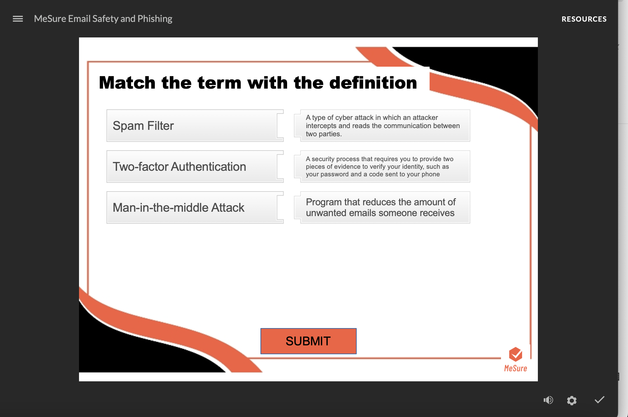 This course is part of a mandatory compliance training and is intended to enable the user to recognize threats to their email security, including phishing, and to protect themselves and their customers from these threats. It is informative and interactive with a realistic scenario to test the learners. It also includes a graded assessment for compliance. It is designed to be experienced on desktop computers, as the LMS is not accessible via mobile devices.